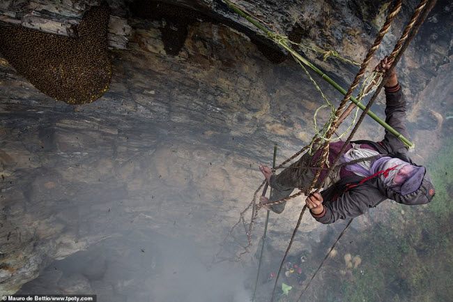 Người đàn ông săn mật ong trên vách đá Himalaya ở Dhaulagiri, Nepal. Ảnh: Mauro de Bettio