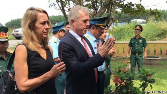 Đại sứ Mỹ Ted Osius và Tổng Lãnh sự Mỹ Mary Tarnowskha thắp hương tại Nghĩa trang Biên Hòa, ngày 24/10/2017. (Ảnh: Facebook Mary Tarnowska)