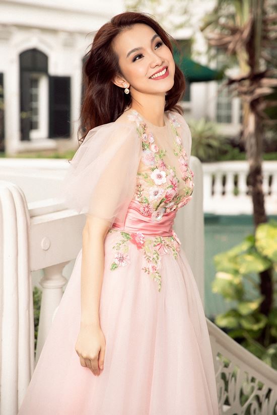 Cô chọn kiểu tóc uốn gợn nữ tính và lối trang điểm nhẹ nhàng, hài hòa với những bộ trang phục.