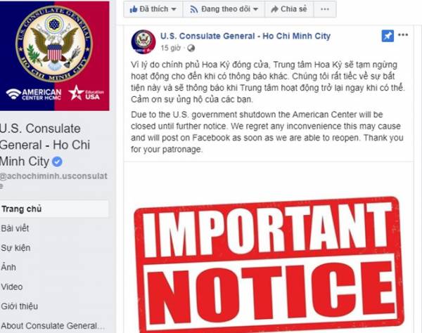 Trung tâm của Hoa Kỳ phải dừng hoạt động tại Hà Nội và TP.HCM. Lý do là vì Chính phủ Mỹ đóng cửa do quốc hội không thông qua được ngân sách mới.