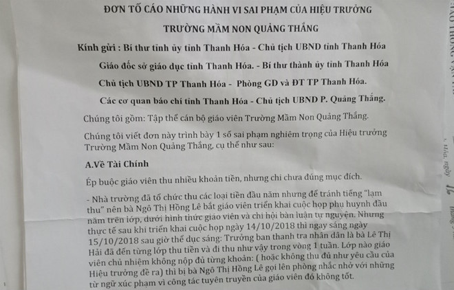 Không chỉ thu chi, sử dụng tài chính vô tội vạ, Hiệu trưởng Trường mầm non Quảng Thắng còn bị tố cáo cho giáo viên hợp đồng nghỉ việc vô cớ; áp dụng hình phạt hà khắc với giáo viên; ăn chặn tiền học bán trú; ăn chặn tiền vệ sinh lớp học…