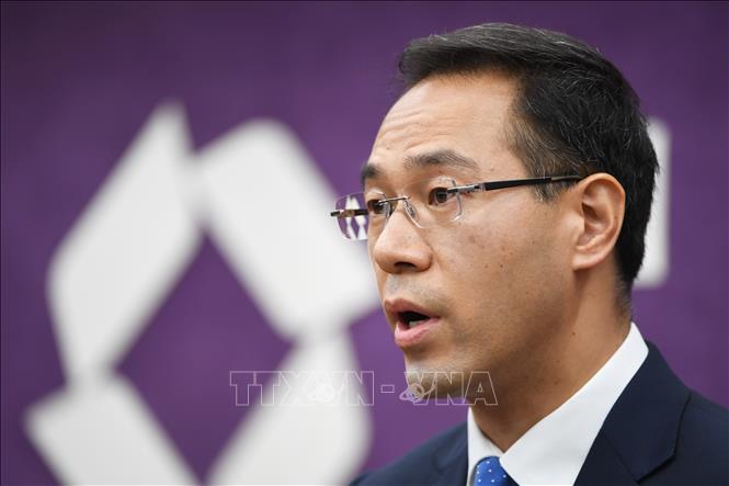 Người phát ngôn Bộ Thương mại Trung Quốc Cao Phong trong cuộc họp báo tại Bắc Kinh ngày 5/7/2018. Ảnh: AFP/TTXVN