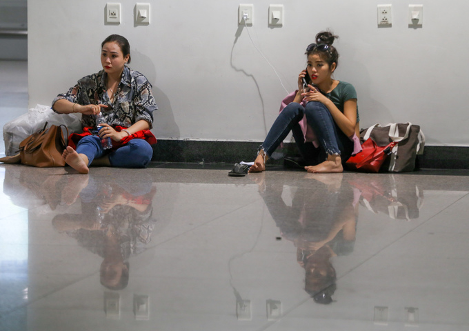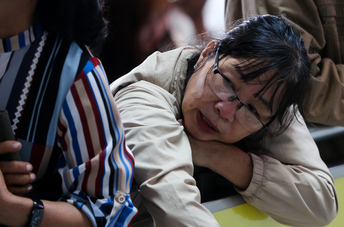 Mệt mỏi sau hàng giờ chờ đợi, nhiều người vạ vật ở khu vực hành lang, sảnh chờ, các bậc thềm...