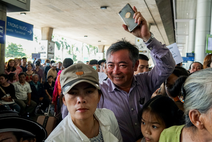 Giữa trưa nắng, nhiều người vã mồ hôi vì chen chúc và phải đợi hàng giờ. "Ông anh ruột của tôi sang Mỹ đã 40 năm nay rồi, lâu lâu mới có dịp về nước ăn Tết. Vì vậy nên cả nhà chục người thuê xe từ Đồng Nai lên đón. Biết đông đúc nhưng gặp lại người thân ai cũng vui mừng", bà Tăng Vòng Kiu (54 tuổi) chia sẻ.