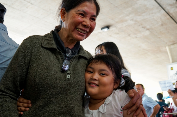 Giây phút đoàn viên của mẹ con bà Út (quê Vĩnh Long). "Con với cha đi xe từ quê lên đây lúc sáng để đón mẹ bên Mỹ về ăn Tết", bé gái nói.