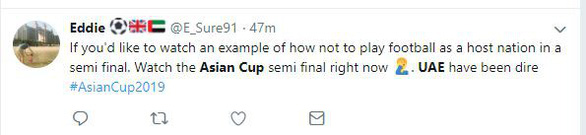 CĐC Eddie đến từ Anh nhận xét gay gắt: "Nếu cần ví dụ về việc không nên đăng cai một trận bán kết với tư cách chủ nhà thì hãy xem trận bán kết Asian Cup. UAE thật sự hỗn loạn"
