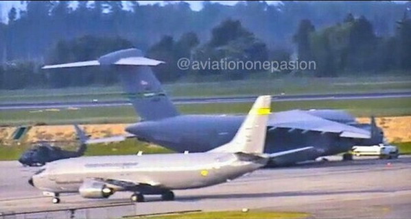Ảnh máy bay vận tải C17 của Hoa Kỳ hạ cánh xuống Colombia sáng 4-2-2019.