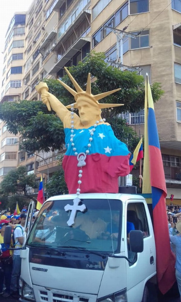 Vietbf.com Nữ thần tự do, cờ Mỹ và hình ảnh TT Trump tràn ngập thủ đô Caracas, Venezuela.
