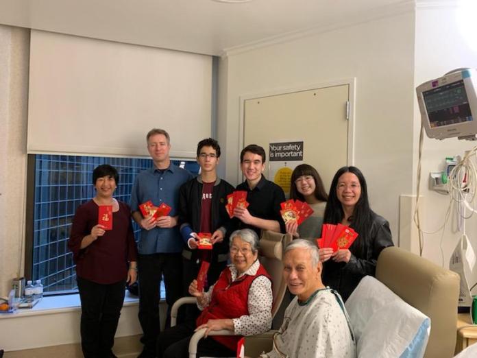 Gia đình cô Yến Price (bìa phải, đứng) đón Tết trong bệnh viện Cedars Sinai ở Los Angeles. (Hình: Yến Price cung cấp)