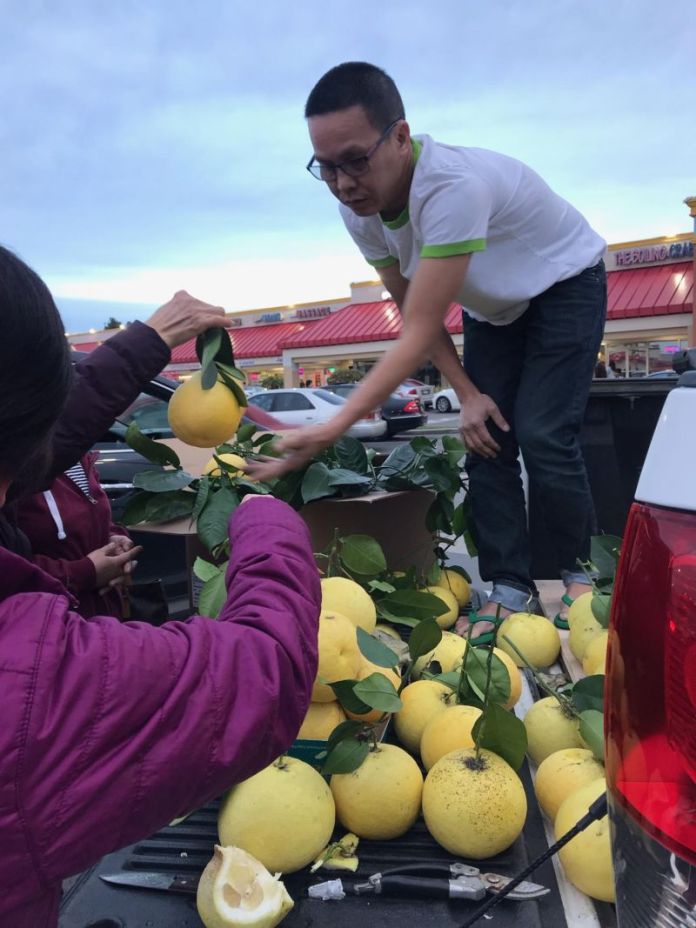 Điều thú vị là để có thêm ít tiền chi tiêu trong dịp Tết, chiều 27 Tháng Chạp, sau giờ đi làm ra, anh Nhơn chất bưởi vàng mà vợ chồng anh hái từ vườn nhà ngày hôm trước lên chiếc xe truck, chạy ra đậu trong parking chợ Hòa Bình, góc đường Brookhurst-Westminster , để… rao bán.