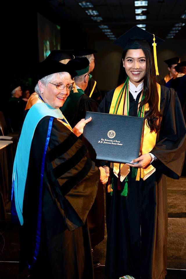 Phương “bật mí”, thực ra cô đã được nhận làm việc tại Viện ung thư MD Anderson ngay trước khi tốt nghiệp. Song do vẫn phải đi thực tập 5 lớp/ mùa nên cô chỉ làm bán thời gian.