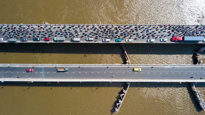 Trong đó, khu vực cầu Bến Lức (hướng về TP HCM) kẹt nghiêm trọng hàng giờ. Do đây là cây cầu độc đạo từ miền Tây về Sài Gòn, lòng cầu thì hẹp nên cứ dịp lễ Tết là ùn ứ. Hàng nghìn ôtô, xe máy chen chúc nhau, nhích từng chút một trên cầu. Rất nhiều xe hai bánh phải đi vào làn xe bốn bánh, trong khi phía cầu hướng ngược lại rất vắng vẻ phương tiện.