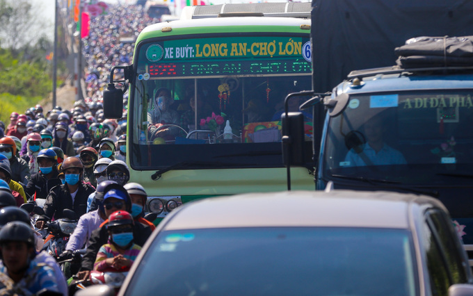 Trưa mùng 6 Tết (10/2), giữa trời nắng khoảng 33 độ C, giao thông tại khu vực Quốc lộ 1A, đoạn giáp ranh giữa huỵên Bến Lức (Long An) và huyện Bình Chánh (TP HCM) kẹt cứng do người dân các tỉnh miền Tây ùn ùn đổ về Sài Gòn làm việc. Do gần TP HCM nên người dân các tỉnh miền Tây đa số đi xe máy.