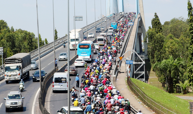 Tại cầu Mỹ Thuận (nối Vĩnh Long và Tiền Giang), cầu Cần Thơ (nối Cần Thơ và Vĩnh Long), cầu Rạch Miễu (nối Tiền Giang và Bến Tre), ôtô, xe máy hướng về TP HCM cũng nối đuôi nhau dài hàng chục km "bò" lên cầu.