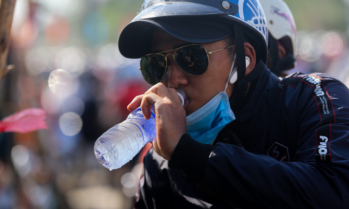 Trới nắng gay gắt, ai cũng che chắn kín mít trên đường và thường xuyên phải dừng lại tiếp nước.