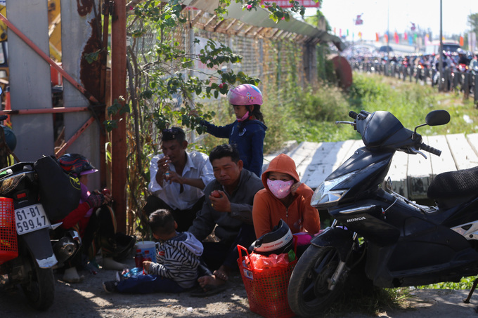 Kẹt xe kéo dài nên rất nhiều người đi xe máy chọn cách tấp vào lề đường nghỉ ngơi, ăn uống. "Đây là chặng nghỉ thứ sáu của nhà tôi trên hành trình từ Vnh Long về thành phố rồi. Đi từ sáng thì vướng kẹt cứng ở cầu Mỹ Thuận, gần đến Sài Gòn thì thêm lần kẹt nữa", anh Kim Huy nói.