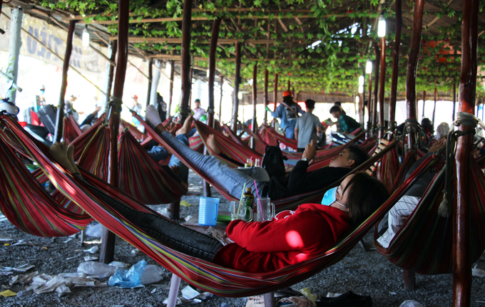 Quá mệt mỏi, nhiều người phải ghé vào các quán nước để trú nắng, chờ giảm xe. Các quán cà phê võng ven đường đều đông đúc.