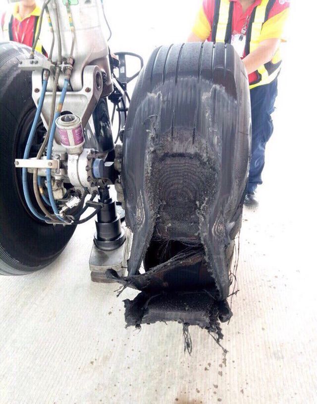 Theo ghi nhận, chiếc lốp bị sự cố nằm ở càng sau của máy bay. Vỏ lốp bị vỡ rách và biến dạng. Trên mặt lốp có vết mòn sâu do lực tác động mạnh.