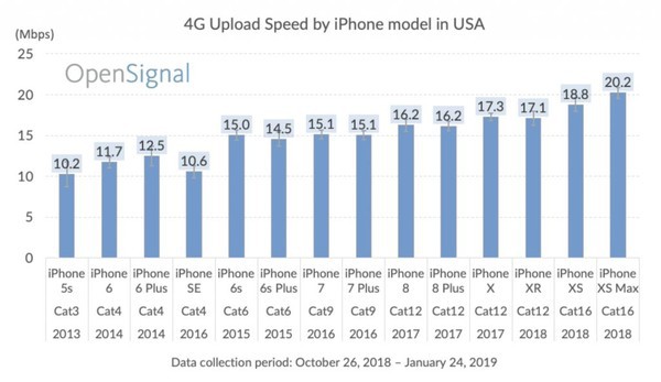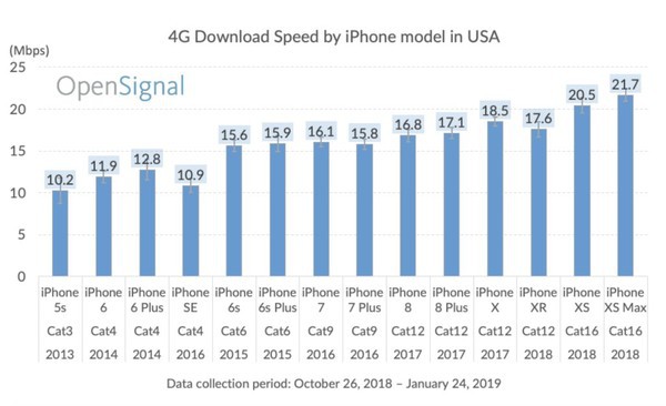 Theo đó, với những người dùng iPhone 5s, iPhone 6 và iPhone 6 Plus, kết quả nghiên cứu cho thấy chúng chỉ có tốc độ dữ liệu di động bằng khoảng một nửa những gì iPhone Xs và iPhone Xs Max mang lại.