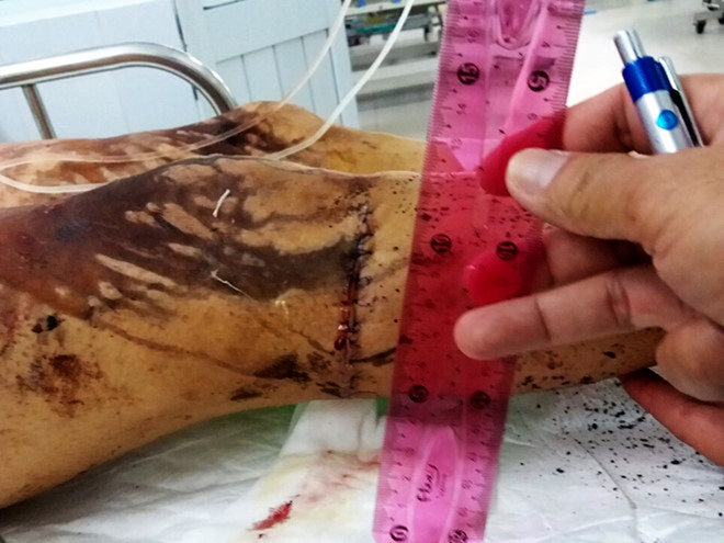 Vết thương vùng chân của anh Võ Duy Nghiệm sau khi bị kẻ xấu tạt axit, dùng dao tấn công. Ảnh: A.Q.