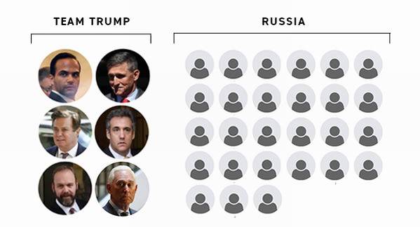 1) George Papadopoulos, cựu cố vấn chính sách đối ngoại của chiến dịch Trump, đã bị bắt vào tháng 7 năm 2017 và đã nhận tội vào tháng 10 năm 2017 khai gian với FBI.