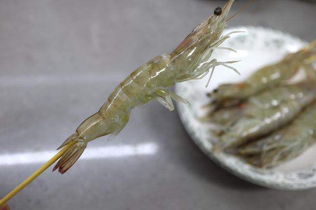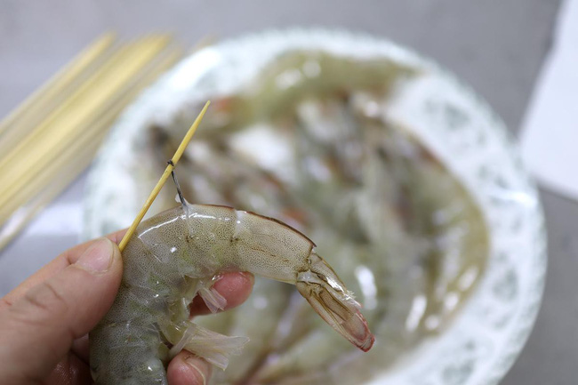 Xiên tre ngâm nước sau đó xiên vào dọc theo thân tôm.