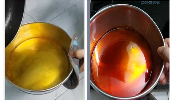 - Đổ 100ml nước đường vào chảo bắt đầu thắng caramel.