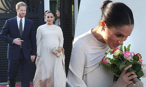 Vừa trở về từ Mỹ sau thời gian thư giãn và tiệc mừng em bé với bạn thân 5 ngày, Meghan vẫn giữ được thần thái tươi tắn. Tuy vậy, Harry không ngừng thể hiện sự lo lắng cho an toàn của Meghan khi canh chừng từng bước đi của vợ.