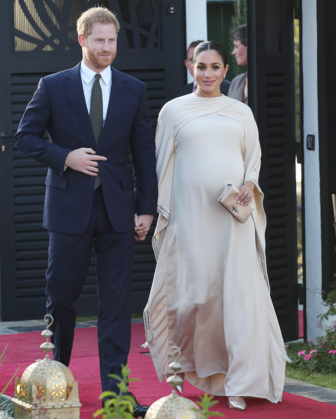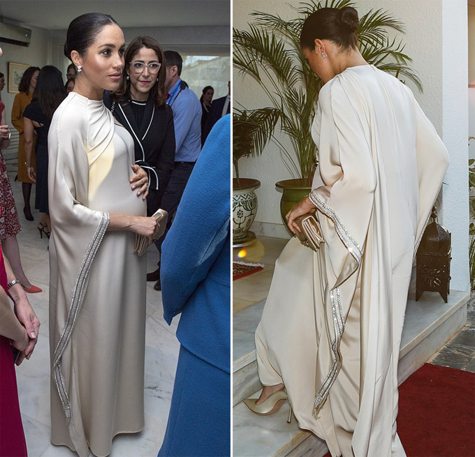 Ba xã Hoàng tử Harry mặc bộ váy choàng đính pha lê lấy cảm hứng từ Kaftan - trang phục truyền thống của phụ nữ Morocco, để tham gia dự tiệc chiêu đãi tại dinh thự của đại sứ Anh ở Morocco, sau khi trở về từ Mỹ sau thời gian thư giãn và tiệc mừng em bé với bạn thân 5 ngày, Meghan vẫn giữ được thần thái tươi tắn.