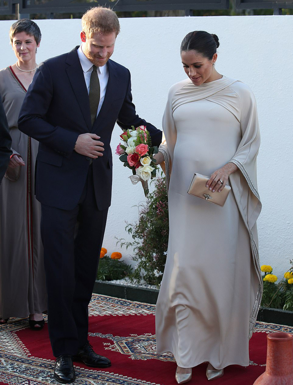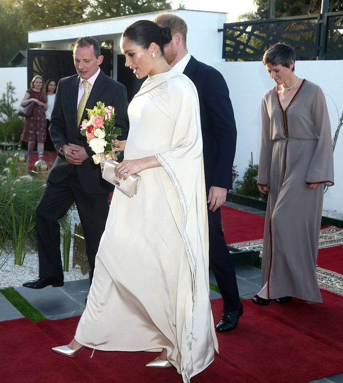 Hình ảnh Meghan cùng chồng, Hoàng tử Harry, dự tiệc chiêu đãi tại dinh thự của đại sứ Anh ở Morocco chiều tối 24/2, bà bầu Meghan gây ấn tượng với bộ váy bằng lụa cao cấp của Dior.