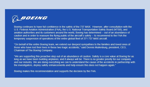 Trump cho biết bất kỳ máy bay nào hiện đang hoạt động thì tiếp tục bay đến đích và sẽ nằm đó. Ông nói thêm tất cả các hãng hàng không và các phi công bị ảnh hưởng đã được thông báo. Trump cho biết sự an toàn của người dân Mỹ là mối quan tâm hàng đầu, và nói thêm rằng FAA sẽ sớm đưa ra tuyên bố về hành động này. Boeing là một công ty tuyệt vời, ông Trump Trump nói. Họ đang làm việc rất rất chăm chỉ và hy vọng họ sẽ nhanh chóng sửa lỗi.