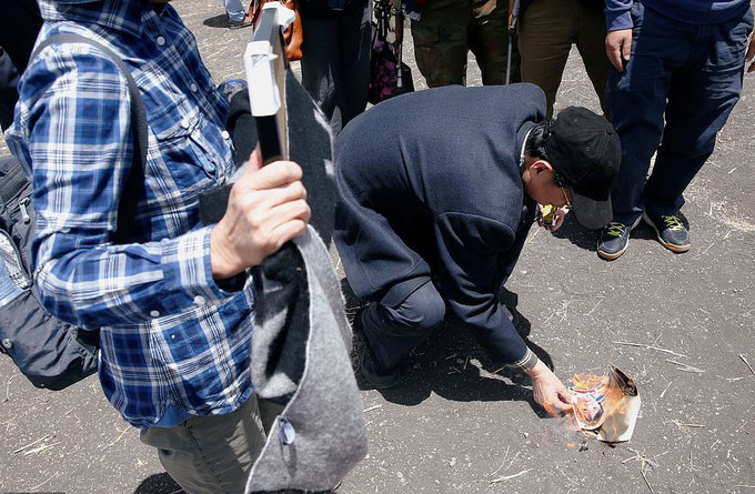 Hai người đàn ông Trung Quốc lặng lẽ ôm hoa đến nơi máy bay rơi.