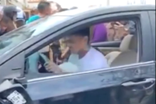 Sau khi gây tai nạn, thanh niên đóng cửa xe, ôm vô lăng lắc lư như bị ngáo đá.