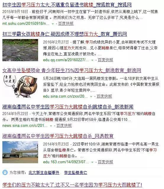 -Ngày 19.4.2016, một nữ sinh trung học ở trường trung học tư thục huyện Feidong, tỉnh An Huy nhảy lầu tự tử. Sau khi tìm kiếm, giáo viên phát hiện ra cô bé đã chết trong một tòa nhà thuộc khu ký túc xá bỏ hoang. Trước khi nhảy xuống, cô bé đã để lại lá thư tuyệt mệnh, nội dung của lá thư cho thấy là do quá áp lực và mệt mỏi trong việc học.