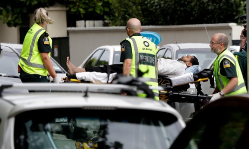 Các nhân viên cứu thương hỗ trợ một nạn nhân sau vụ xả súng ở hai nhà thờ tại New Zealand. Ảnh: AP.