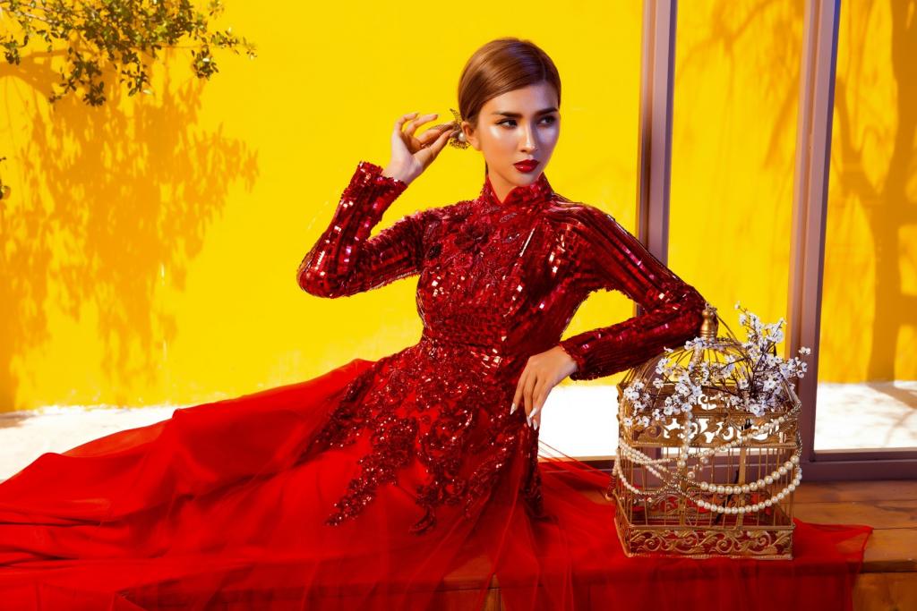 Kim Tuyến biến hóa đầy quyền lực và bí ẩn trong sắc đỏ. Toàn bộ phần thân áo và tay áo đều được xử lý bằng những chi tiết đính kết, mang đến vẻ ngoài lấp lánh hút mắt người nhìn.
