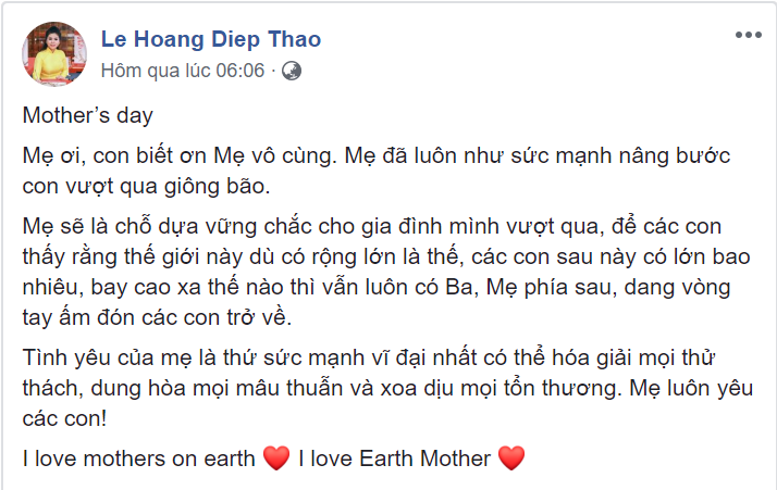 Bà Thảo gửi lời biết ơn đến người mẹ của ḿnh cũng như động viên các con về t́nh yêu của người mẹ - điều mà bà Lê Hoàng Diệp Thảo cho rằng là "thứ sức mạnh vĩ đại nhất có thể hóa giải mọi thử thách, dung ḥa mọi mâu thuẫn và xoa dịu mọi tổn thương".