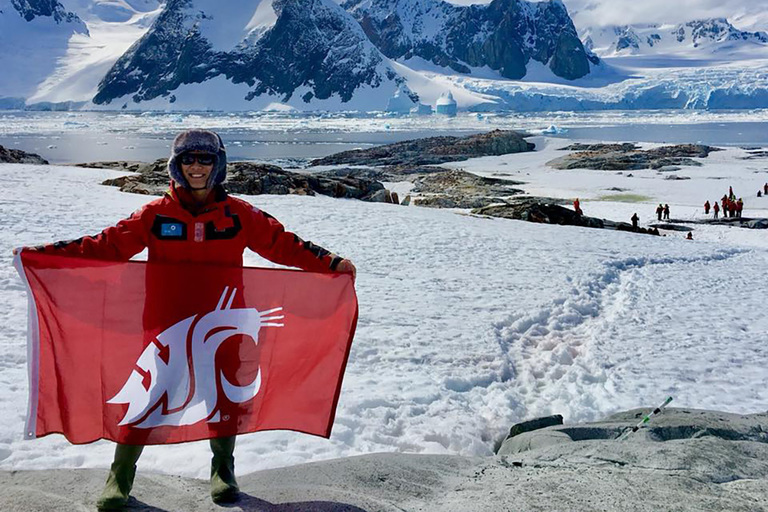 Nam Nguyễn đã trưng cờ của trường tại Nam Cực trong hình trên. (WSU)
