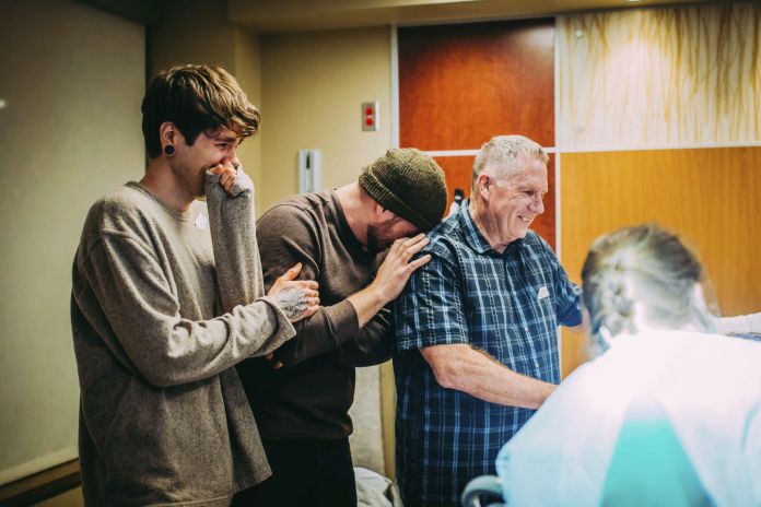 Elliot Dougherty (trái) và Matthew Eledge (thứ nhì từ trái) xúc động khi đứa bé sinh ra ở Nebraska Medical Center tại Omaha, Nebraska. (Hình: Ariel Panowicz via AP)