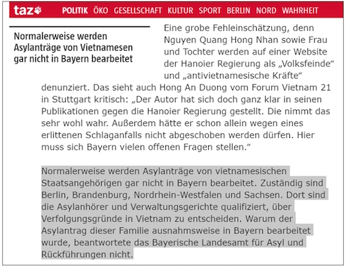 “Điểm đáng chú ý, thông thường thì các văn phòng chi nhánh của Sở Liên bang về Di cư và Người tị nạn ở tiểu bang Bayern không phụ trách về các đơn xin tị nạn của người Việt Nam. Các đơn này thường chỉ được xét ở các bang Berlin, Brandenburg, Nordrhein-Westfalen và Sachsen. Ở đó, các nhân viên được đào tạo nghiệp vụ có đủ trình độ chuyên môn để quyết định các trường hợp người Việt Nam xin tị nạn và thẩm định những mối nguy hiểm có thể xảy ra nếu người đó phải về Việt Nam. Người ta không biết tại sao đơn xin tị nạn của Nguyễn Quang Hồng Nhân lại được xét xử ngoại lệ ở bang Bayern do các nhân viên không đủ khả năng xem xét.”