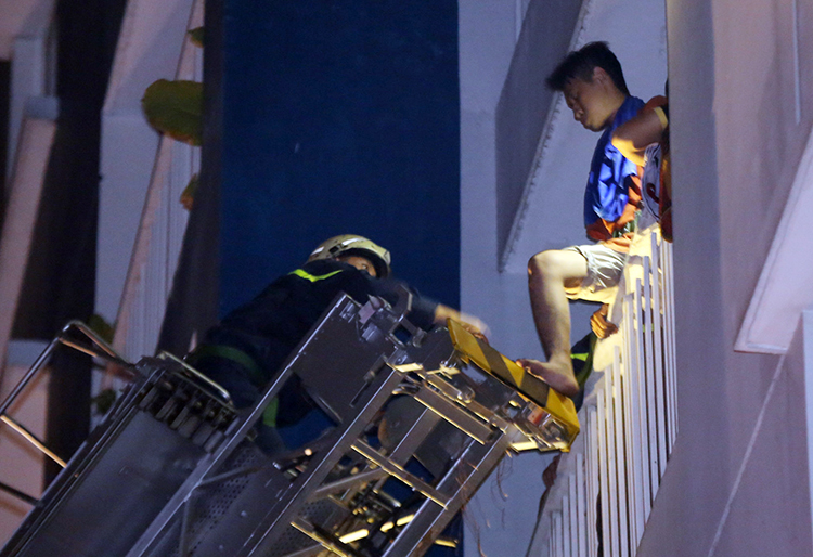 Cảnh sát đưa xe thang cứu người ở chung cư Carina. Ảnh: Quỳnh Trần.