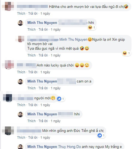 Mới đây, trên trang Facebook cá nhân của mình, nữ diễn viên gây tò mò khi đăng tải hình ảnh ngồi cạnh một anh chàng người nước ngoài trên cùng một chuyến bay, kèm theo đó là dòng chú thích mùi mẫn: "Anh ngủ là lỗi của anh, mà để anh ngủ say là lỗi của em. Thiết nghĩ trong cuộc tình này 2 ta đều có lỗi".