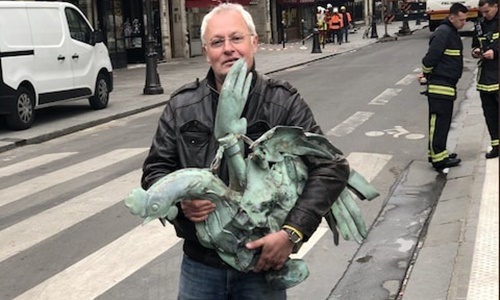 Lãnh đạo Liên đoàn các Nhà thầu Xây dựng Pháp Jacques Chanut đã đăng lên mạng bức ảnh ông ôm bức tượng con gà trống màu xanh đứng trên phố. Một quan chức Bộ Văn hóa cho hay khi mái nhọn của nhà thờ đổ, tượng gà trống bị tách ra và "rơi xuống vị trí tốt, tránh xa khỏi đám cháy".