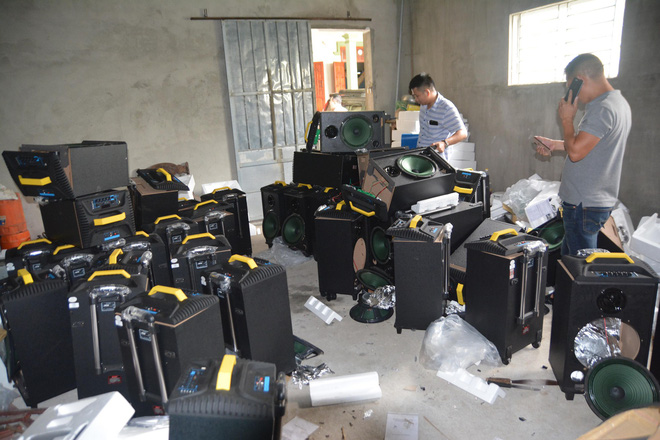 16h ngày 17/4, công an ập vào kiểm tra kho hàng tại nhà Nguyễn Thị Tâm (SN 1977, trú xóm 1, xã Quỳnh Hồng, Quỳnh Lưu) phát hiện 50 loa thùng, 1 cân đĩa, nhiều tang vật liên quan.