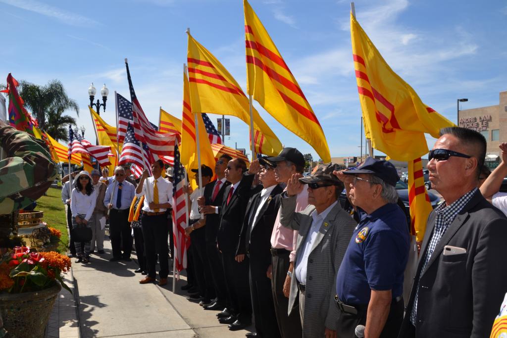 Vào lúc 3 giờ chiều, mọi người tập trung trước tượng đài Đức Trần Hưng Đạo làm lễ chào cờ và mặc niệm. Sau đó, chiến hữu Trần Vệ mời ông Phan Kỳ Nhơn, Chủ Tịch Liên Ủy Ban Chống Cộng Sản và Tay Sai, cũng là người chủ xướng các cuộc biểu tình chống Cộng phát biểu ý kiến. Niên trưởng Phan Kỳ Nhơn ngỏ lời chào và cám ơn những người có mặt, sau đó ông nêu lên một số vấn đề: Một là sự xâm nhập của chế độ Cộng Sản ở hải ngoại; hai là phổ biến Chuỗi Sinh Hoạt trong Tháng Tư Đen của cộng đồng người Việt tỵ nạn Cộng Sản; ba là sự xáo trộn trong thành phố Westminster.Trước tiên ông nói việc Nguyễn Phú Trọng bị đột quỵ tại Kiên Giang và đưa về bệnh viện Chợ Rẫy cấp cứu, “nếu tin này có thật thì đó là điều đáng mừng cho chúng ta vì chết một tên Việt Cộng nào là đỡ đi một phần cho chúng ta.” Về vấn đề sự xâm nhập của Việt Cộng, ông đặt câu hỏi, “Tại sao lúc này Việt Cộng lại gia tăng xâm nhập vào Cộng đồng chúng ta, điển hình như có xe mang cờ đỏ sao vàng xuất hiện trong thành phố Westminster? Tại sao có những Email có hình VC đội nón cối tay cầm cờ đỏ sao vàng thách thức chúng ta? Tại sao?” Và ông trả lời, “Chẳng qua có một biến cố ở thành phố Westminster qua cái Nghị Quyết vinh danh một người không phải là cư dân Westminster, không phải là người của VNCH chúng ta. Chúng ta không nói nó là người Cộng Sản nhưng nó là người của chế độ CS. Sự kiện này là phần nổi của một tảng băng mà phần nổi thì ai cũng biết, chuyện này không riêng gì nước Mỹ mà cả thế giới đều biết, vì chúng ta đang sống trên đất nước thượng tôn luật pháp, chúng ta xử sự bằng luật pháp, và chúng ta không thể đánh võ mồm hay không thể dùng những phương thức khác, vì chúng ta đang sống trên đất nước thượng tôn luật pháp, chúng ta dùng luật pháp. Phần nổi không quan trọng và thời gian rồi sẽ đi tới, nhưng điều quan trọng là phần chìm của tảng băng, chúng ta chưa biết mục tiêu nó là gì, và hành động nó sẽ ra sao? Đó là điều quan trọng chúng ta cần tìm hiểu trong những ngày tháng sắp tới để chúng ta có thái độ ngăn chận. Đó là việc làm của chúng ta. Chúng ta dùng luật pháp mà đối xử với nhau, chúng ta không dùng luận điệu xuyên tạc như chế độ Cộng Sản.”
