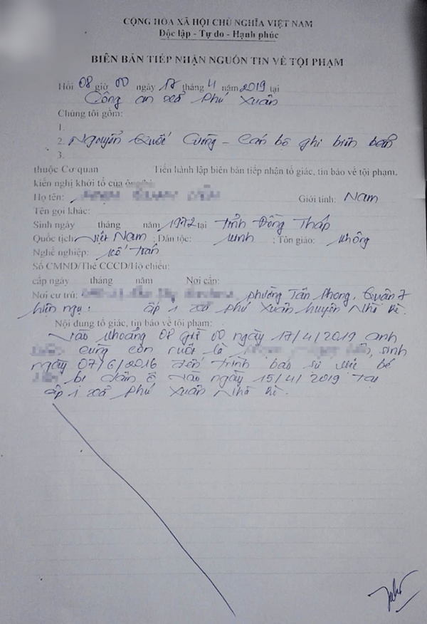 Biên bản tiếp nhận vụ việc của Công an xã Phú Xuân, huyện Nhà Bè.