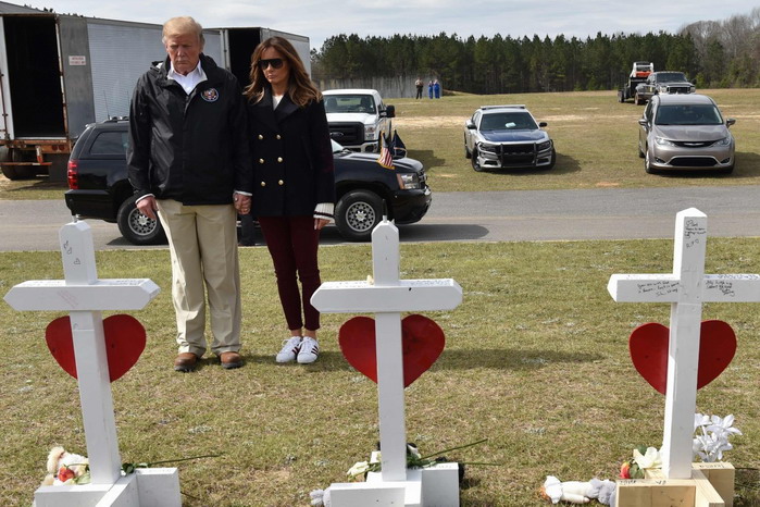 Đệ nhất phu nhân Melania Trump đôi khi được thay thế bởi một người phụ nữ khác giấu sau cặp kính râm lớn và trang phục tương tự xuất hiện khi ông Trump thực hiện chuyến đi đến địa điểm của cơn lốc xoáy chết người ở Alabama. Để ý kỹ bạn sẽ thấy không một ai chụp được mặt bà Melania khi bà bỏ kính râm xuống.
