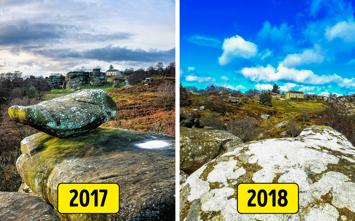 Vào tháng 6 năm 2018, trẻ em đã lật đổ một trong những tảng đá cân bằng ở Brimham Rocks, hòn đá vỡ thành từng mảnh, công trình 320 triệu năm lịch sử đã biến mất chỉ trong vài giây.