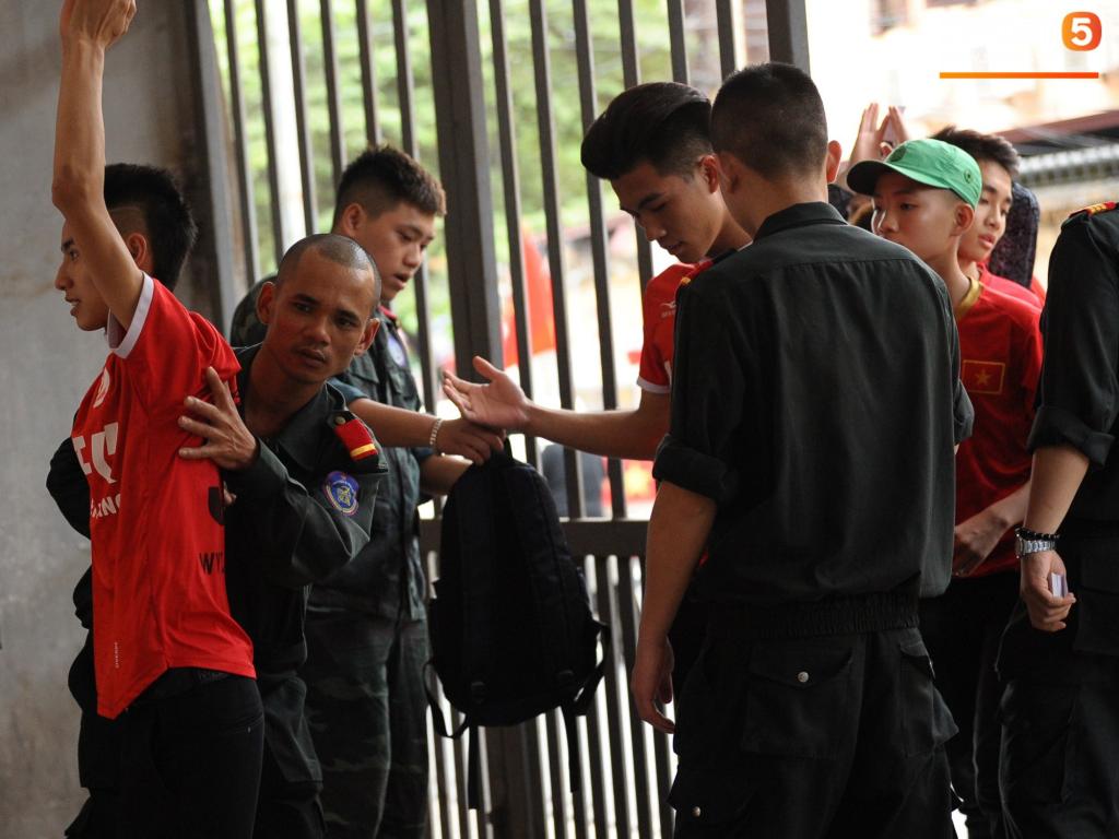 Để vào được khu vực khán đài B16 dành cho CĐV Hải Phòng, người hâm mộ phải trải qua sự kiểm tra chặt chẽ của lực lượng an ninh.