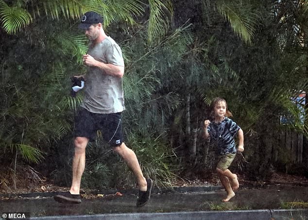 Ngày hôm qua, Chris Hemsworth cùng vợ Elsa Pataky được bắt gặp đang mắc mưa ngoài đường khi đón con trai tại trường mẫu giáo ở Byron Bay. Đáng chú ý, trong khi nam tài tử nổi tiếng trông vô cùng thong dong chạy dưới mưa thì cậu con trai nhỏ đằng sau vô cùng chật vật khi chạy theo bố.